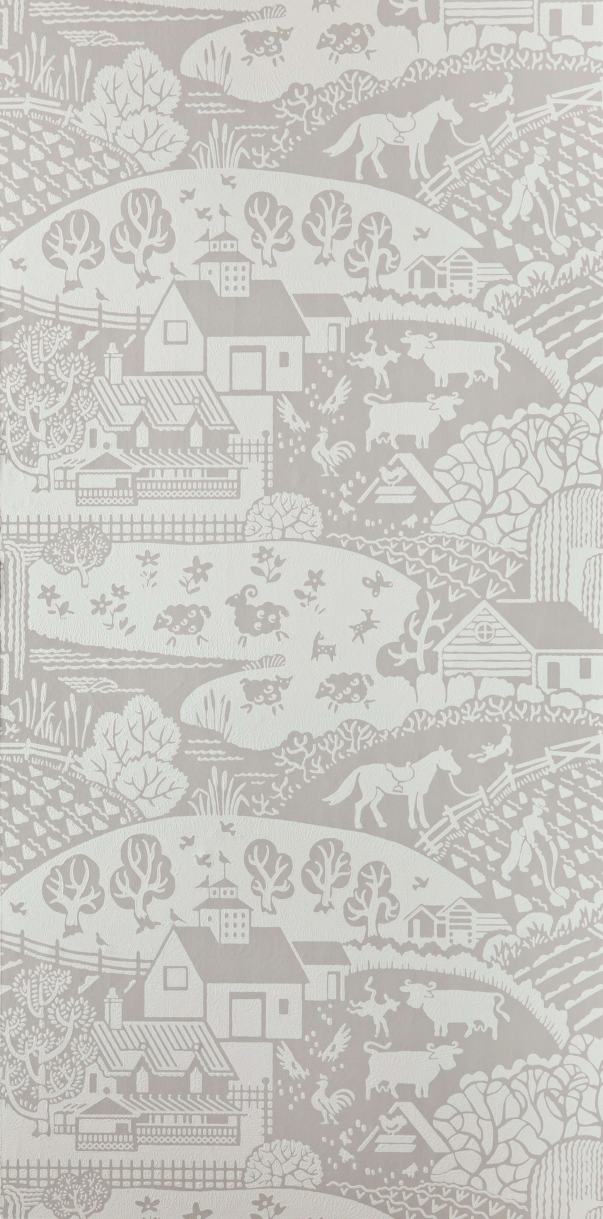 Gepflügte Äcker, Holzzäune, Kühe, Pferde, Katzen, Hunde – Gable zeigt das Leben eines Bauernhofs in einer geradezu kindlichen Idylle. Durch ihr cleanes, modernes Styling kann sie auf einer Wand einen großformatigen Akzent setzen, der friedlich und detailreich zugleich wirkt.