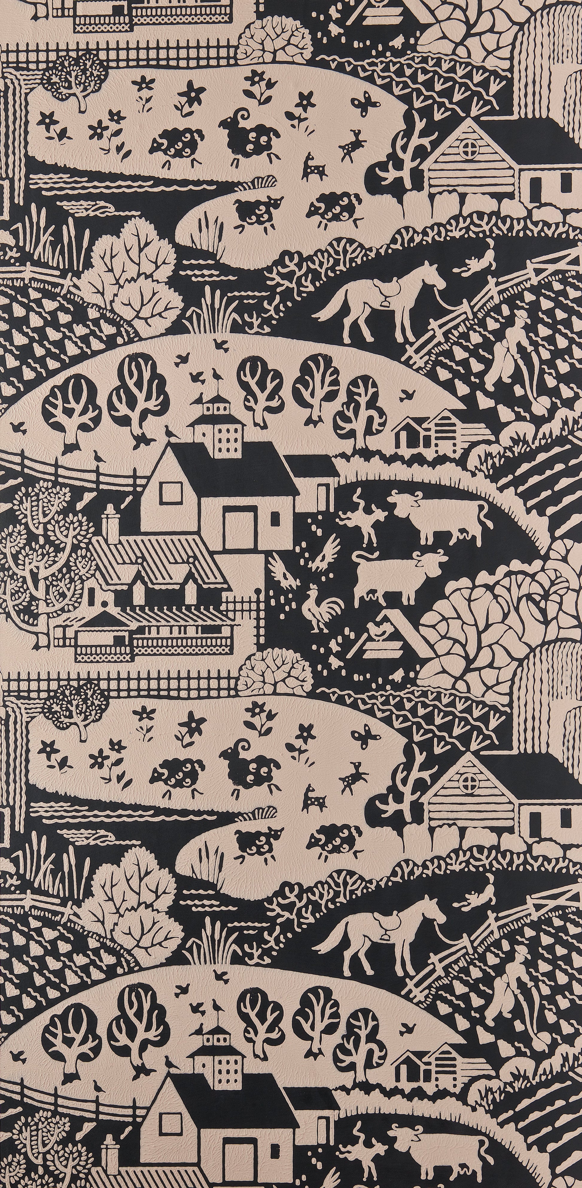 Gepflügte Äcker, Holzzäune, Kühe, Pferde, Katzen, Hunde – Gable zeigt das Leben eines Bauernhofs in einer geradezu kindlichen Idylle. Durch ihr cleanes, modernes Styling kann sie auf einer Wand einen großformatigen Akzent setzen, der friedlich und detailreich zugleich wirkt.