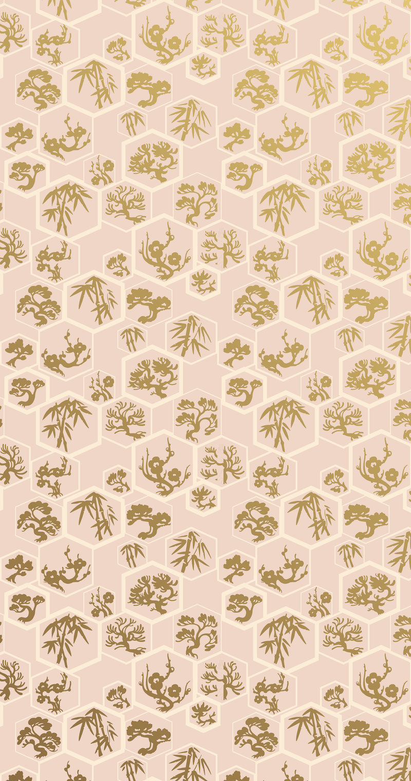 Shouchikubai ist das japanische Wort für„die drei Freunde des Winters: Pflaume, Pinie und Bambus“. Sie haben die Fähigkeit, den kalten Monaten zu widerstehen und stehen im fernen Osten für Stärke, Schönheit und langes Leben. Die botanischen Motive, die in sechseckigen Rahmen eingefangen sind, verleihen allen Räumen Anmut und Exotik.